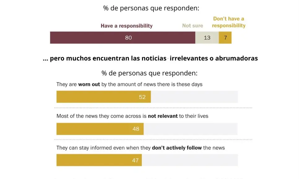 Por otro lado, dos tercios de las personas entrevistadas dijeron que dejaron de seguir al menos una fuente informativa, y seis de cada diez admiten haber reducido de manera consciente su consumo de noticias.