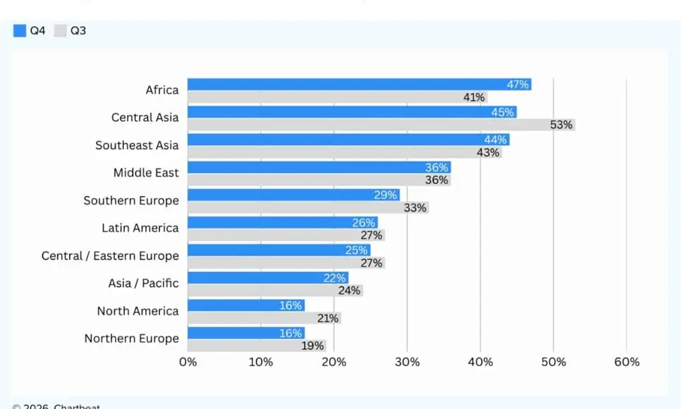 Las visitas a páginas web desde motores de búsqueda cayeron en prácticamente todas las regiones del mundo, con excepción del Sudeste Asiático y Medio Oriente, destaca el reporte del cuarto trimestre de la firma de analítica Chartbeat.