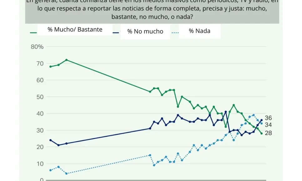 La pérdida de credibilidad viene a la baja históricamente. En los años 70, Gallup registraba niveles de confianza en los medios superiores al 70% pero para finales de los años 90, esa cifra cayó a 53%. En 2016, tras la fuerte polarización de las campañas presidenciales, la cifra se desplomó.