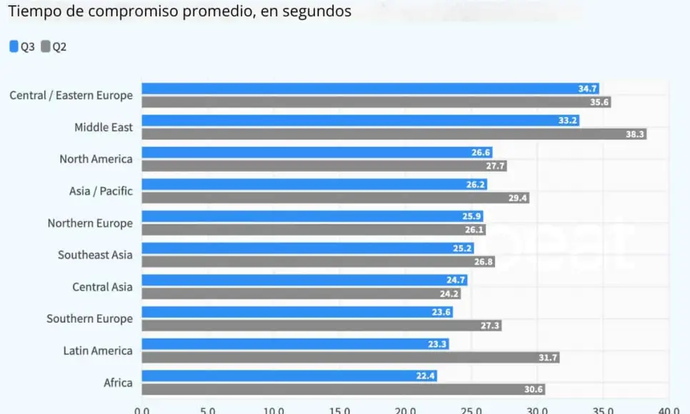 Los usuarios de Europa Central y del Este fueron los más comprometidos, con un promedio de 34.7 segundos por sesión, seguidos por Medio Oriente (33.2) y América del Norte (26.6).