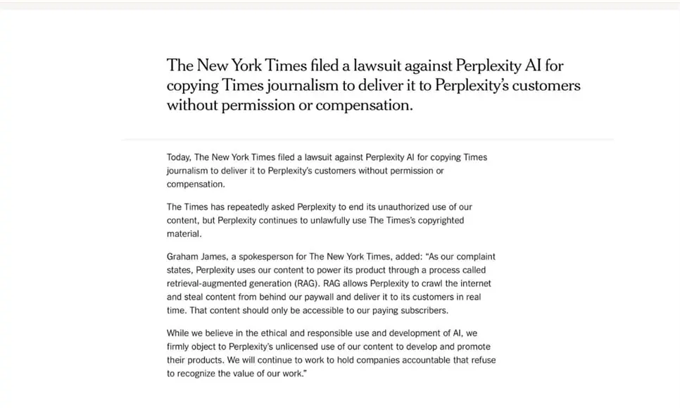 "Como afirma nuestra queja, Perplexity utiliza nuestro contenido para impulsar su producto a través de un proceso llamado generación aumentada de recuperación (RAG). RAG permite a Perplexity rastrear Internet y robar contenido de detrás de nuestro muro de pago y entregarlo a sus clientes en tiempo real. Ese contenido solo debería ser accesible para nuestros suscriptores de pago”, dijo Graham James, portavoz de The New York Times en un comunicado.