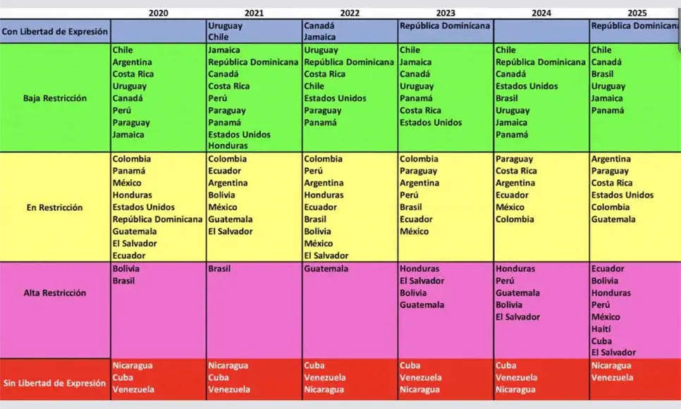 El análisis técnico, elaborado junto con investigadores de la Universidad Católica Andrés Bello, mostró que por primera vez una amplia mayoría de los países medidos se concentra en franjas de restricción, con seis naciones, y de alta restricción, con 8 países. En tanto, Nicaragua, y Venezuela quedaron en esta última categoría, denominada ‘Sin libertad de expresión'.