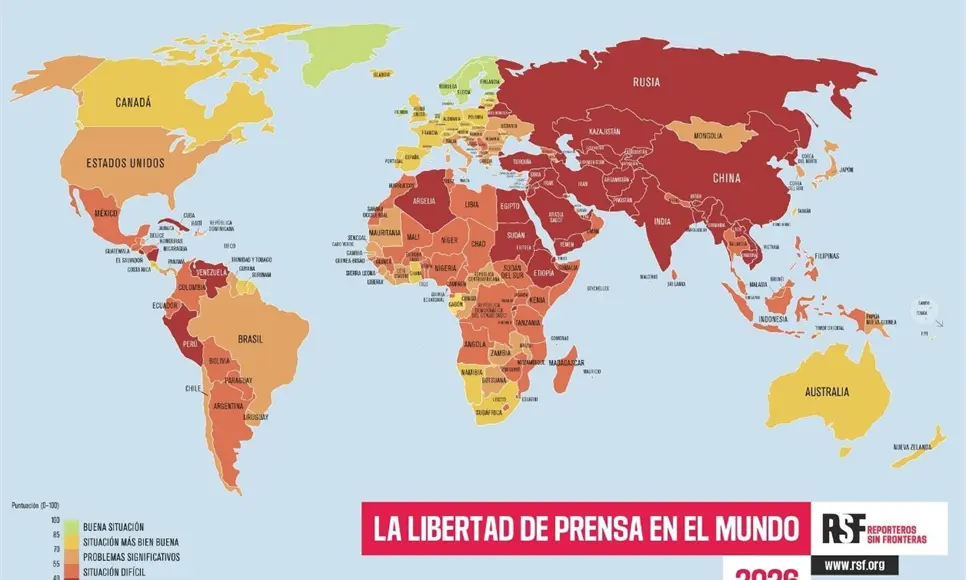 2026 es el peor año en los 25 años de historia del Índice Mundial de Libertad de Prensa de Reporteros Sin Fronteras (RSF), y por primera vez, más de la mitad de los países del mundo se ubican en las categorías “difícil” o “muy grave” para la libertad de prensa, informó la organización.