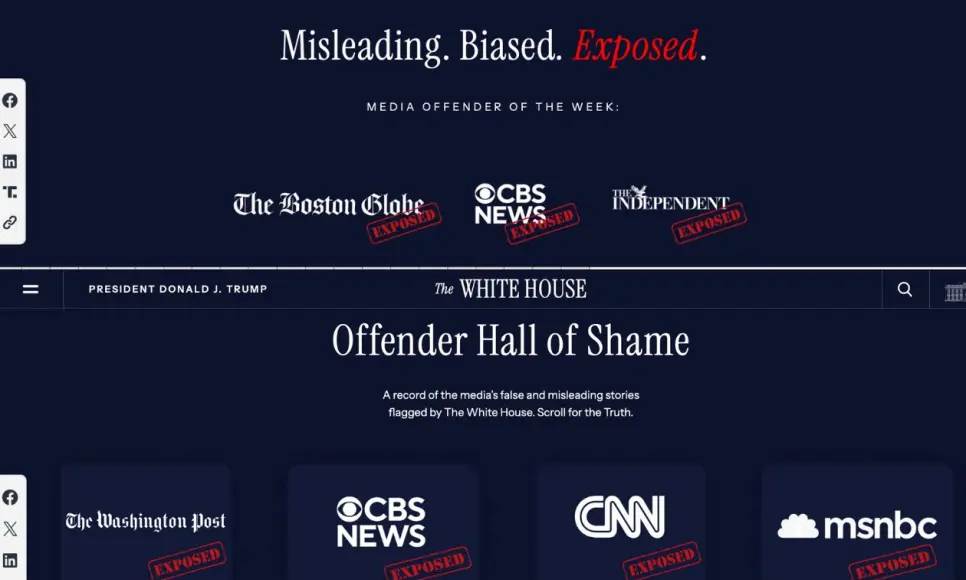 En la nueva sección también se habilitó un “Salón de la Vergüenza” o “Hall of Shame” con nombres de medios que, según el gobierno, habrían incurrido en faltas reiteradas. Entre los medios expuestos se encuentran The Washington Post, CNN, MSNBC, Politico, The New York Times y The Wall Street Journal.