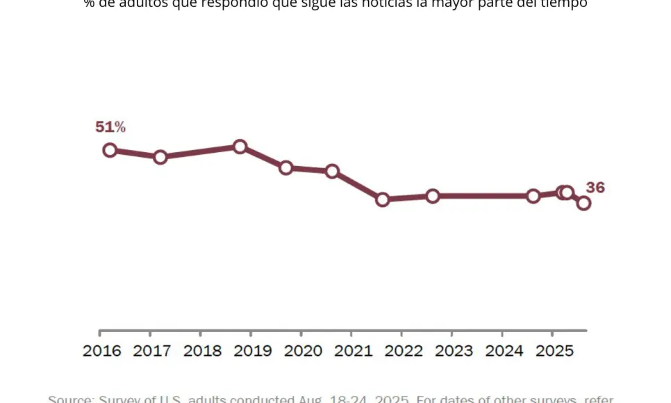 En términos políticos, los republicanos y simpatizantes republicanos han mostrado el mayor descenso en seguimiento de noticias, al bajar de 57% en 2016 a 36% en 2025, una baja de 21 puntos porcentuales.