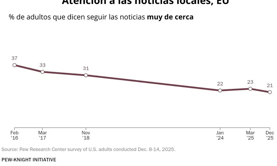 De acuerdo con el más reciente análisis del Pew Research Center, en 2025 solo el 21% de los estadounidenses afirma seguir las noticias locales muy de cerca, una reducción significativa frente al 37% registrado en 2016.