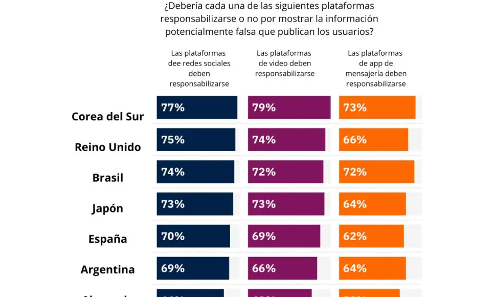Además, la mayoría de los entrevistados de todos los países piensan que las plataformas deberían ser responsables de la información falsa publicada por los usuarios.