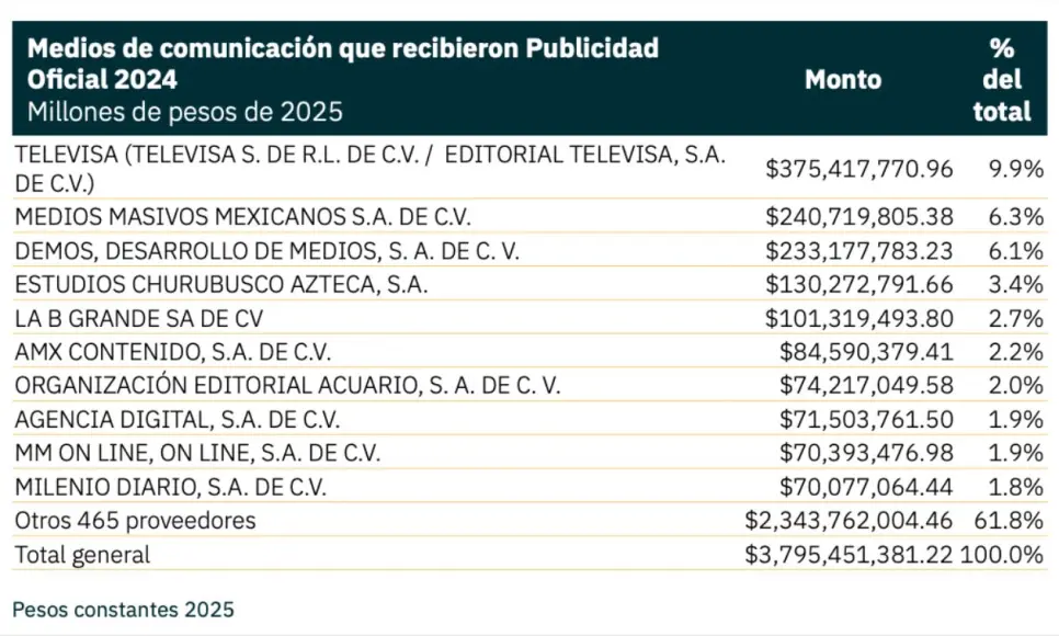 A este respecto, solo en el sexenio de AMLO, Televisa recibió 1 mil 877 millones de pesos, La Jornada (Demos, desarrollo de medios) mil 596 millones, TV Azteca mil 340 millones, y el grupo Medios Masivos Mexicanos mil 282 millones de pesos, concentrando más del 33% del gasto total federal.
