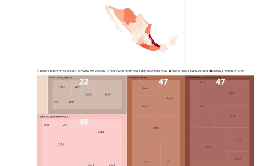 Del total de casos a nivel nacional, 22 ocurrieron durante el sexenio de Vicente Fox, 48 en la administración de Felipe Calderón; 47 en el gobierno de Enrique Peña Nieto; 47 durante el mandato de Andrés Manuel López Obrador; y 9 en lo que va de la actual administración de Claudia Sheinbaum.