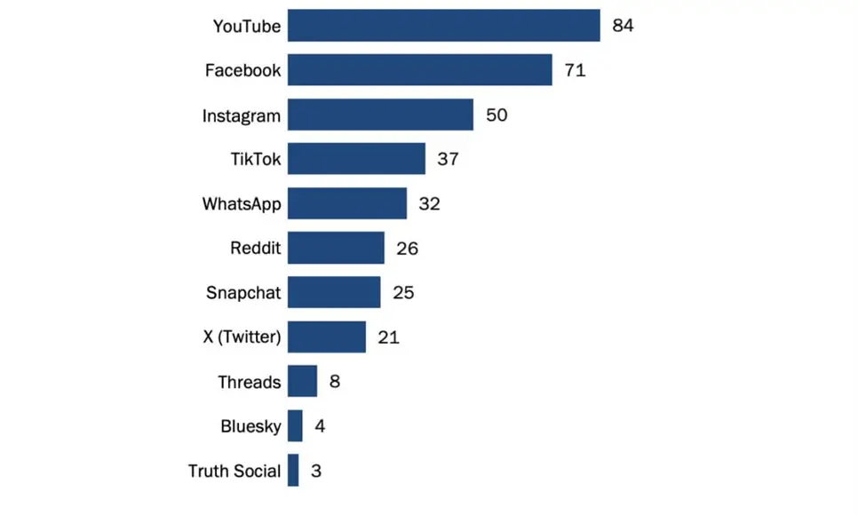 YouTube (84%) y Facebook (71%) se mantienen como las plataformas digitales más utilizadas entre los adultos estadounidenses, revela una nueva encuesta del Pew Research Center aplicada entre febrero y junio de 2025 a más de 5 mil personas.